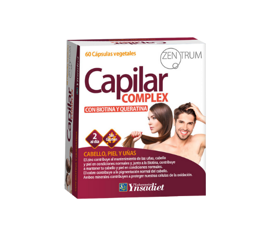 Capilar Complex Zentrum es un complemento alimenticio diseñado para fortalecer el cabello, nutrir la piel y mejorar la resistencia de las uñas. Su fórmula combina extracto de Sabal, Queratina hidrolizada, Biotina, Zinc y Cobre, actuando de manera sinérgica para apoyar la salud capilar, proteger frente al daño oxidativo y promover un aspecto saludable y vital.