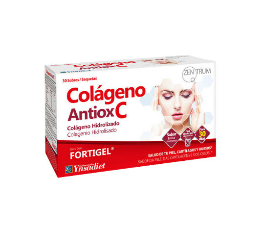 COLÁGENO ANTIOX C es un complemento formulado para cuidar piel, cartílagos y huesos de forma integral. Cada sobre aporta péptidos de colágeno hidrolizado (Fortigel®) de alta calidad junto a magnesio, ácido hialurónico, extractos vegetales (açai y bambú) y vitamina C —ingredientes que actúan de forma sinérgica para apoyar la formación de colágeno, mantener la elasticidad de tejidos y ofrecer protección antioxidante.